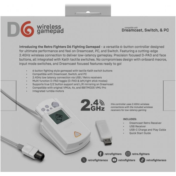Manette Sans fil Retro Fighters D6 Dreamcast Blanche pour Nintendo Switch, Switch 2, PC Windows et Sega Dreamcast